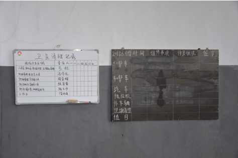 一白一黒兩塊寫字板,分別記錄著車間衛(wèi)生和機車維護的記錄。