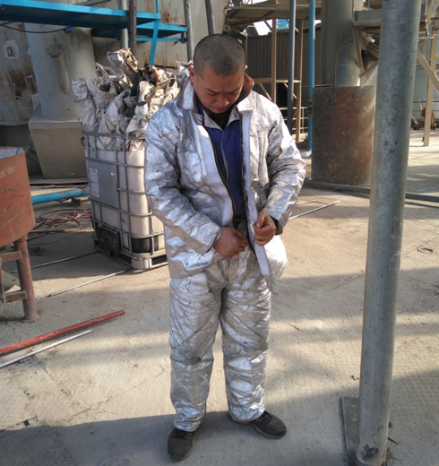 操作工周京文正在穿戴防護(hù)服為投運(yùn)廢噸包做準(zhǔn)備