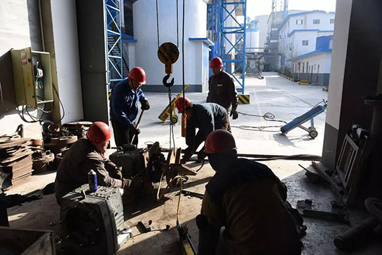 旋窯車間維修工們對減速機(jī)齒輪進(jìn)行檢修