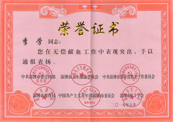 祝賀集團(tuán)公司和李學(xué)董事長榮獲市無償獻(xiàn)血榮譽(yù)