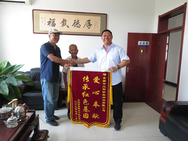 7月3日上午,大趙村主任王志恒同黃驊紀念館工作人員一行4人將一面“愛心奉獻、傳承紅色基因”的錦旗送到黃驊三陽總經(jīng)理王軍林的手上,感謝他們?yōu)辄S驊紀念館的捐贈。王軍林總經(jīng)理接過錦旗,深情地說:“吃水不忘打井人,我們始終牢記革命先烈立下的豐功偉業(yè),感恩黨給我們帶來的幸福生活,我們重山人崇尚像黃驊將軍這樣的民族英雄,今后將與黃驊紀念館加強溝通,作為今后公司黨建教育的重要基地,對于紀念館盡微薄之力是應該的。”王志恒主任表示對黃驊三陽的愛心奉獻非常感謝,熱烈歡迎黃驊三陽經(jīng)常性到紀念館參觀,為紀念館的建設提出寶貴意見,將紅色文化發(fā)揚光大。