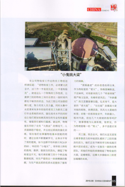 近日,《中國水泥》雜志2019年第9期刊發(fā)了《凝心聚力 創(chuàng)新圖強》一文。文章生動再現(xiàn)了黃驊三陽干部員工在這片鹽堿地上奮斗身影和工作風彩、團隊風彩,進一步宣揚了黃驊三陽在致良知思想引領下的精神風貌和工作業(yè)績,也為提升企業(yè)品牌形象發(fā)揮了更好的作用。