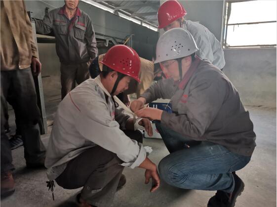 16:35,演練開始。粉磨車間副主任劉強接到通知,維修工在3#包機修理輸送皮帶時,操作工誤開啟設備,導致維修工左手夾在輸送皮帶與托輥之間,無法拿出。劉強隨即報告車間主任韓凱并趕往現(xiàn)場救援,同時韓凱召集各小組成員,啟動應急救援預案,攜帶救援、醫(yī)療物資前往現(xiàn)場。經(jīng)過搶險救援小組現(xiàn)場搶救,受傷人員手臂從皮帶上取下,醫(yī)療救護組對傷員進行止血等簡單治療,然后送往醫(yī)院進一步治療。