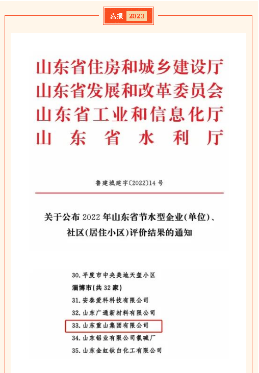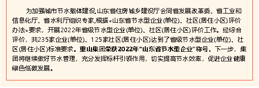 【榮譽(yù)】重山集團(tuán)榮獲2022年“山東省節(jié)水型企業(yè)”稱號(hào)