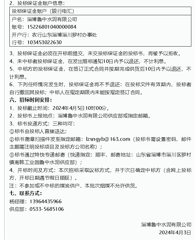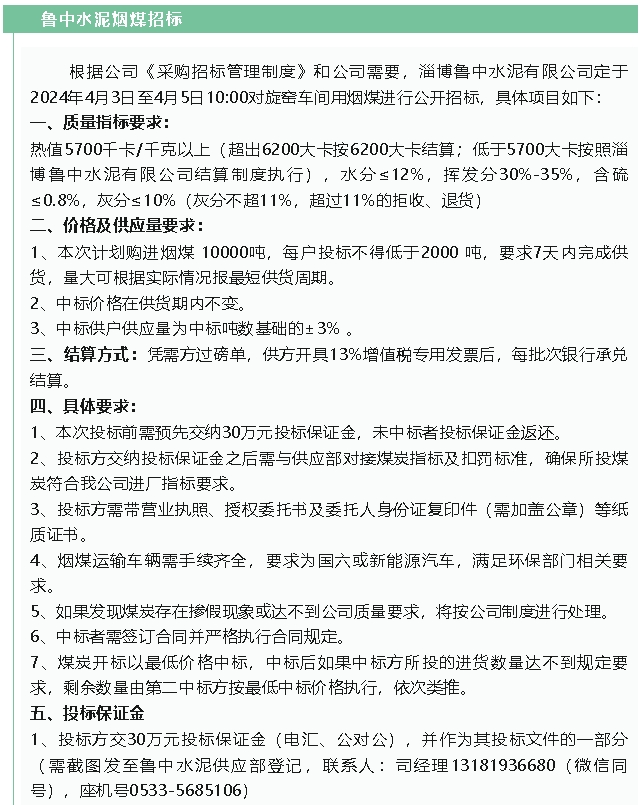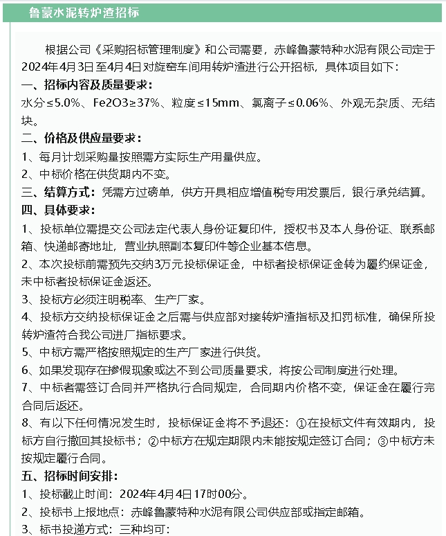 【招標公告】魯中水泥煙煤、魯蒙水泥轉爐渣招標