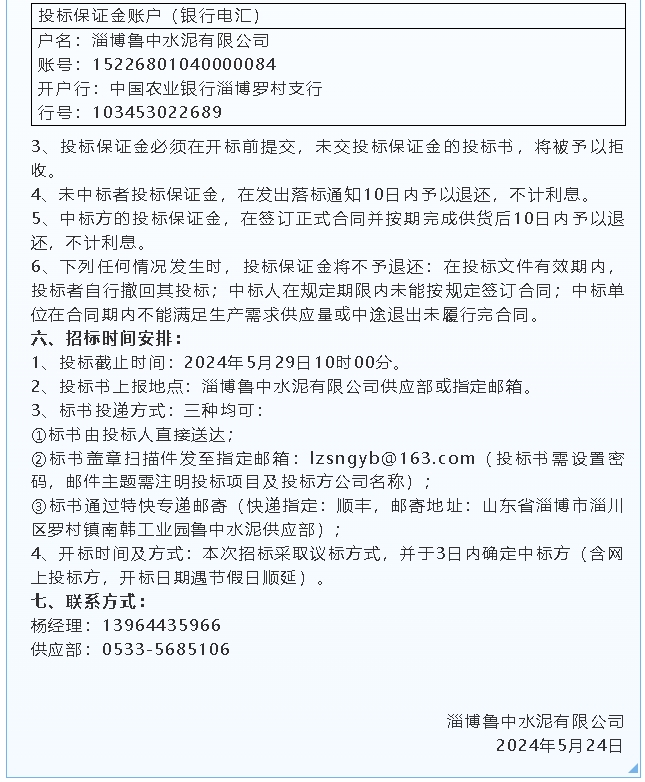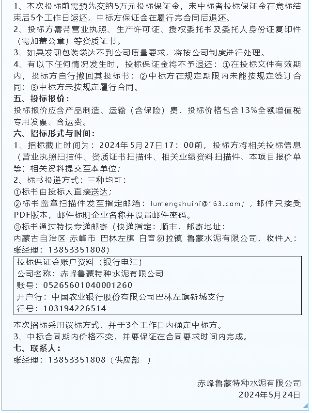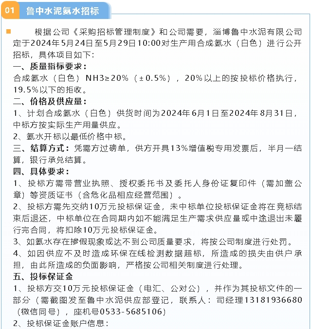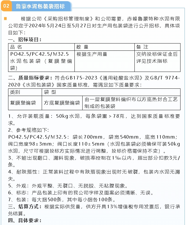 【招標(biāo)公告】魯中水泥氨水、魯蒙水泥包裝袋招標(biāo)