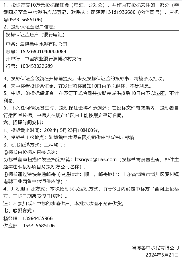【招標(biāo)公告】魯中水泥包裝袋、水渣,螢澤礦業(yè)普查治理報(bào)告、礦粉運(yùn)輸招標(biāo)