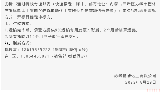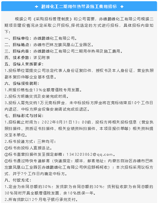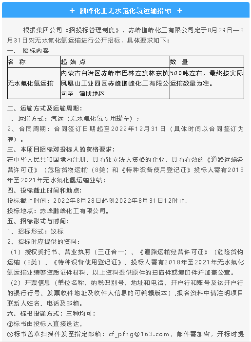 【招標(biāo)公告】鵬峰化工無(wú)水氟化氫運(yùn)輸、二期用伴熱帶及施工費(fèi)用招標(biāo)